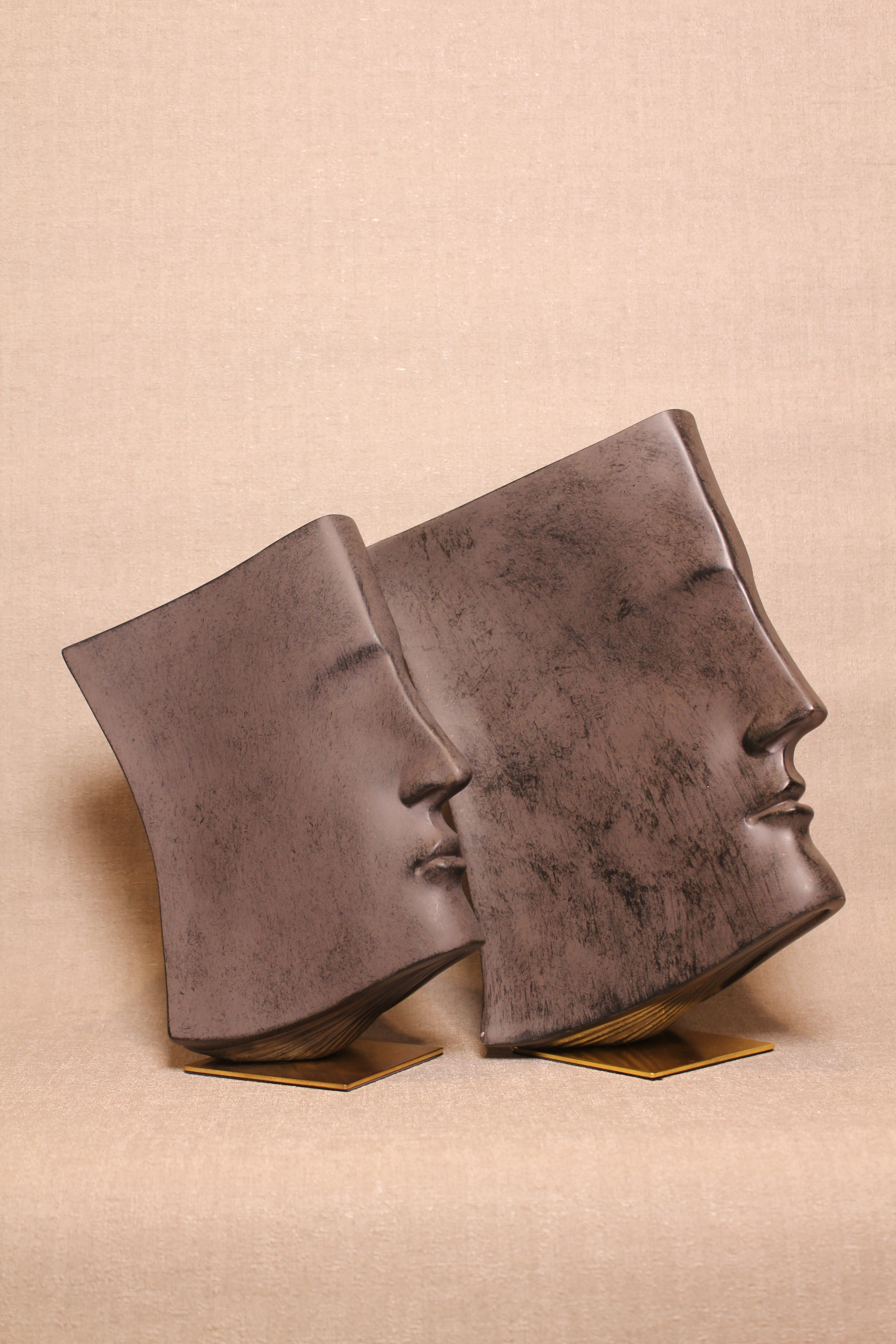 1. This Book and Face Statue is an abstract face art deco piece made of sculpted resin with an antique metal look.